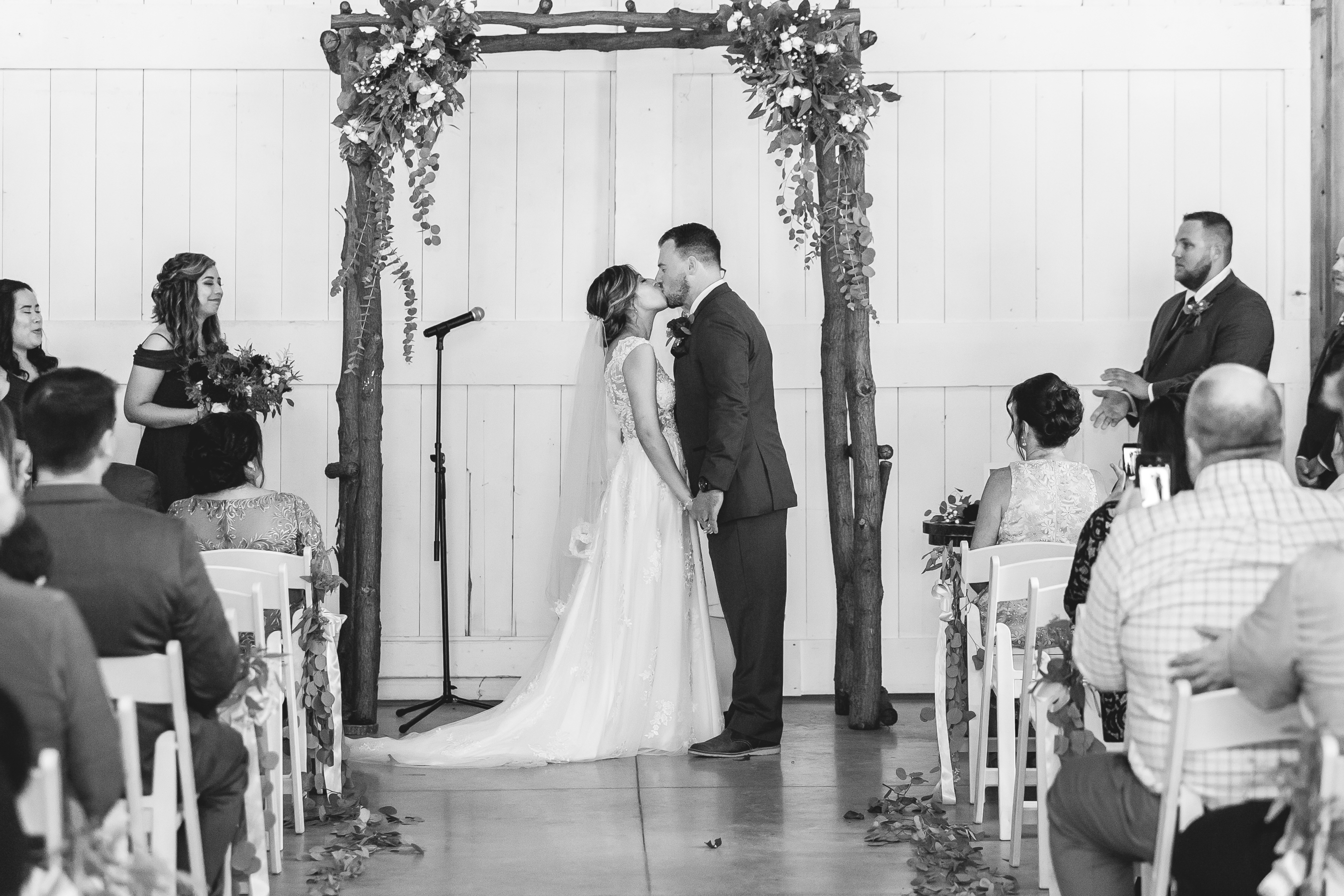 Because of the on and off rain in the morning, and a forecast calling for nothing but rain all week, the couple’s outdoor ceremony was moved into the barn. One of the many reasons why I love Emerson Creek is that no matter where your ceremony is – indoors or outdoors – it will be beautiful.