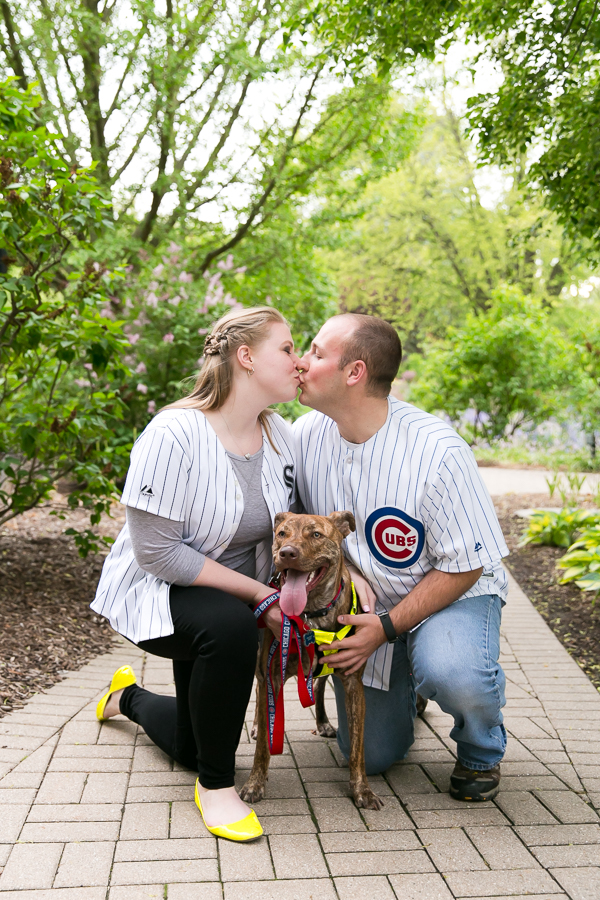 Rose and Jeremy are fans of two rival sports teams. She’s a White Sox fan, and he roots for the Cubs. I love how they decided to wear their jerseys for some of their engagement photos. They also brought along their dog, Tigger. He is adorable, and was quite excited during the session. It took a little bribing (treats) to get him to sit still 😉